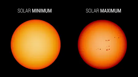 The “quiet” phase, known as the solar minimum, occurs when sunspot numbers drop close to zero. The “active” phase, the solar maximum, is marked by numerous sunspots and frequent solar flares.